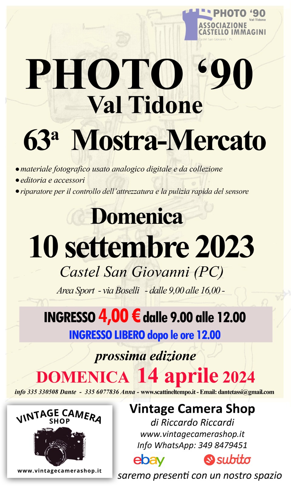 Domenica 10 settembre 2023 si è tenuto a Castel San Giovanni, in provincia di Piacenza, la mostra mercato di materiale fotografico usato, analogico, digitale e da collezione organizzato dall’Associazione Castello Immagini. L’evento ha visto la partecipazione di numerosi espositori e appassionati di fotografia, che hanno potuto scambiare, vendere e acquistare materiale fotografico vario anche d’epoca e raro a trovarsi.